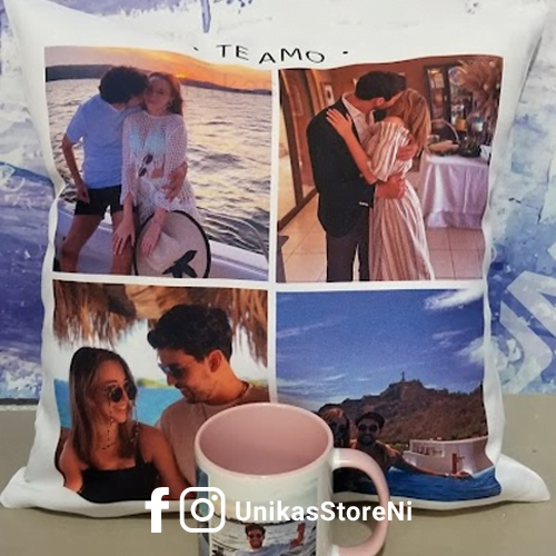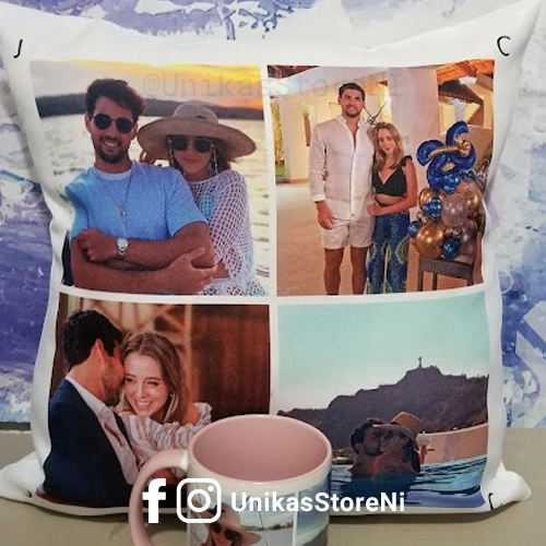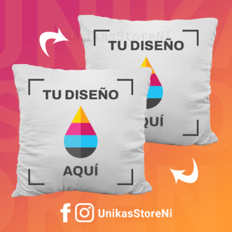 Cojin blanco 38x38cm personalizado 2 caras, incluye funda impresa y relleno.
