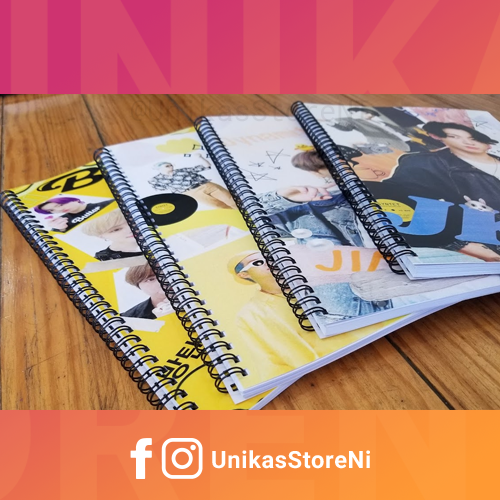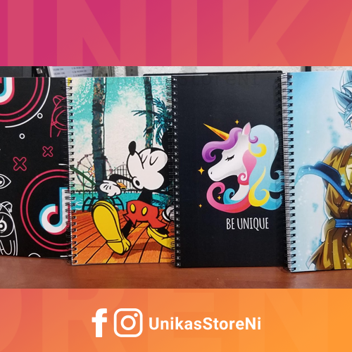 Cuaderno universitario 8.5×11″ pasta cartulina sulfito full color personalizada, interior hojas rayadas a 2 caras. Precios por unidad: 60 hojas C$150 cord, 80 hojas C$200 cord, 100 hojas C$250 cord.