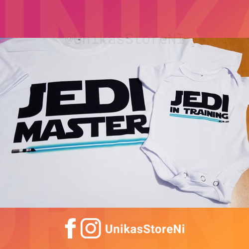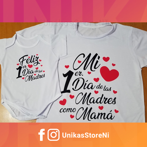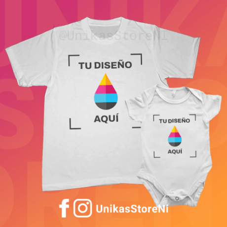 Combo dúo camiseta blanca unisex cuello redondo y mameluco blanco para bebe, ambos tacto algodón (mezcla con poliester) personalizados, Camiseta en tallas juveniles #2 – #14, unisex S – XL. Nota: En tallas especiales XXL y XXXL el precio varia. Mameluco en tallas 1M – 24M.