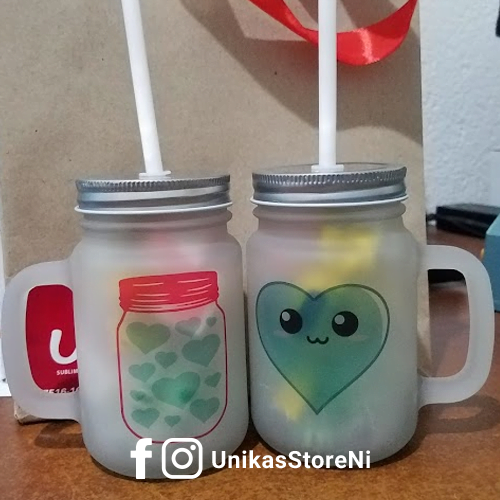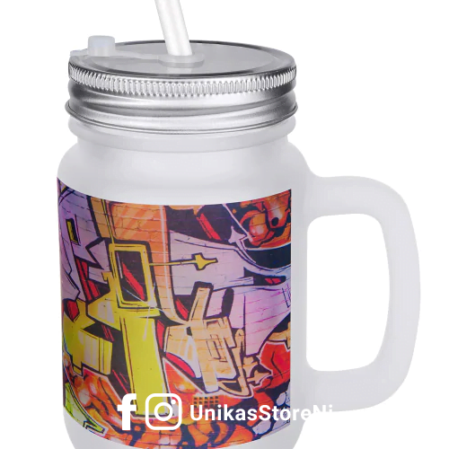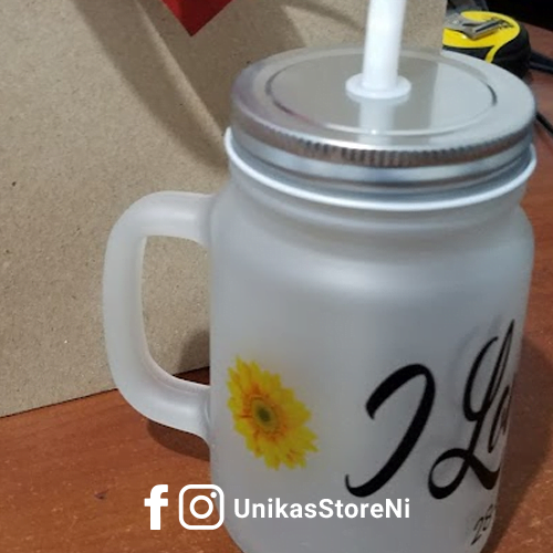Jarra de vidrio mason 350ml frosted glaseado con tapa rosca metálica y pajilla.